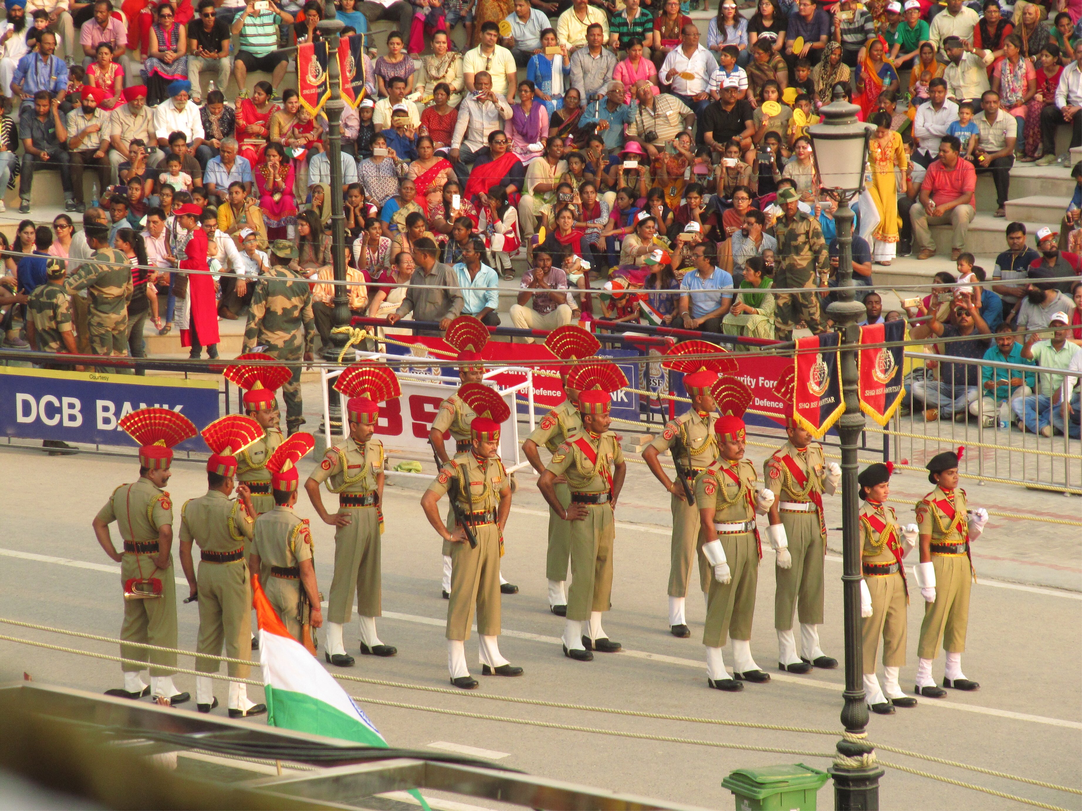 Aber das Schlimmste sind nicht die Soldatinnen und Soldaten selbst, das Schlimmste ist die wild gröhlende Masse, die in einem einer Arena gleichenden Halbrund Platz genommen hat – und wie auf Kommando wild losschreit und applaudiert, als spontan 3 adipöse Inderinnen fahnenschwenkend auf das indische Stahltor zulaufen. (Es scheint ihre einzige sportliche Aktivität zu sein.) Und als dann Soldatinnen und Soldaten (auf beiden Seiten versteht sich) aufmarschieren gerät die indische Menschenmasse völlig in Extase. Auf pakistanischer Seite geht es dagegen, bis auf etwas Klatschen und Inschallah recht gesittet zu. Doch weit gefehlt, es geht noch mehr!! In dem Moment, als dann beide Stahltore geöffnet werden nimmt der Lärmpegel für jedes normale Trommelfell bedenkliche Werte an.