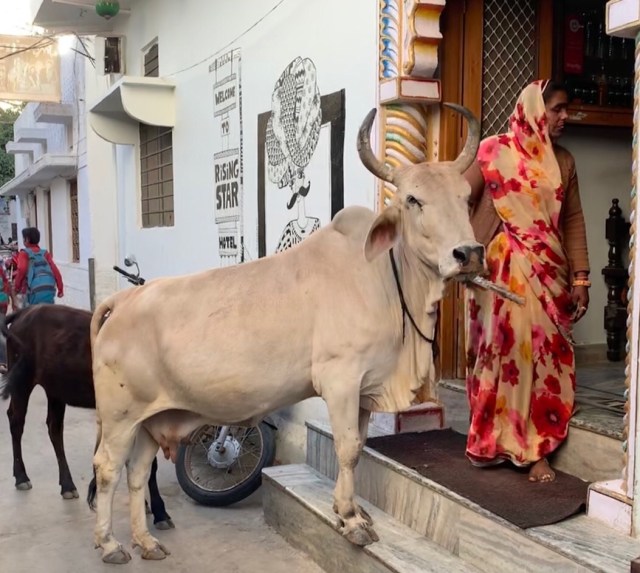 Eben habe ich beim Breakfast im FUNKEY MONKEY von Francine (einer Italienerin die schon viele Jahr abwechseln Irland und Indien lebt) erfahren, dass das mit den heiligen Kühen füher sehr viel schlimmer war. Ein Drama sozusagen. Ohne Futter, sterbend im Dreck – aber heilig. Eine Europäerin hat vor 14 Jahren eine Auffangstation für kranke Kühe gegründet. Sie befindet sich ca. 10 Kilometer ausserhalb von PUSKHAR. Leider gibt es meine Zeit heute an meinem letzten Tag hier nicht her, diese Station zu besuchen. Zudem gibt es nun auch eine Ambulance. Sie holen verunfallte oder kranke Kühe ab und bringen sie ins Lager. Dort werden sie gepflegt. Mittlerweile hat sich auch die Einstellung der Einheimischen zur ihren heiligen Paarhufern geändert. Sie werden mit Grünzeugabfall gefüttert. Leider sehe ich trotzdem immer noch Kühe die Pappkartons fressen.