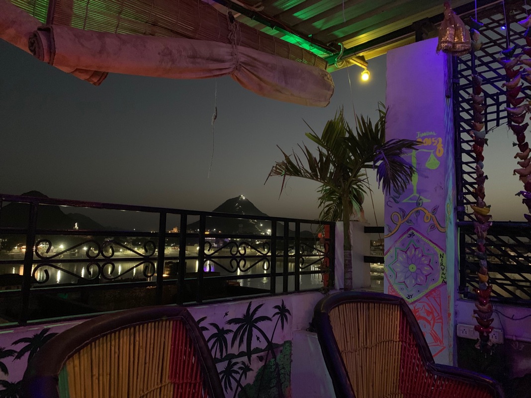 Nur gut 40 Stufen nach oben und schon bin ich im NIRWANA. (Und da wird immer behauptet, dies zu erlangen wäre schwierig…) Das NIRWANA ist ein 360 Grad Rooftop Restaurant mit einem Traumblick über den PUSKAR LAKE. Ebenso traumhaft ist das Essen und auch die Musik. Ein angenehmer Technobeat tanzt um meine Ohren. Die Wände sind bunt verziert, teils mit floureszierenden Farben welche im Schwarzlicht um die Wette strahlen. An einer Seite hängen hunderte von kleinen Stoffvögeln von der Decke herab. Wenn sie zu fliegen beginnen waren die Mushrooms im Omlett die flaschen…