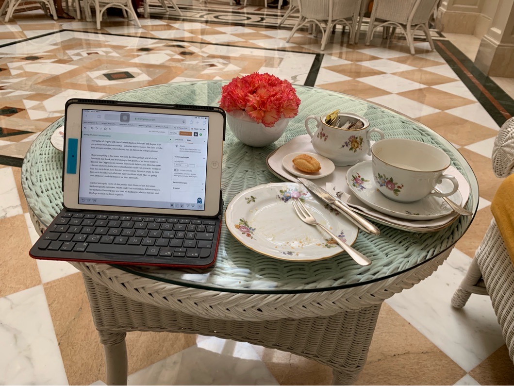 „I hope everything is fine mam“, hat eben der Ober gefragt und ich habe freundlich mit „thank you everything is fine“ geantwortet. Im zu erklären, daß mir der Cappucino in meinem Stammcafe delmocca in München 1000 x besser schmeckt, hätte jetzt wahrscheinlich nicht viel gebracht. Vielleicht liegt das auch daran, daß ihn dort meine Tochter für mich brüht. (Sie studiert und jobbt nebenbei in diesem wirklich netten Cafe.) Da hilft hier auch das silberne Löffelchen zum Umrühren nicht. Aber, es geht ja ums Ambiente und das können sie hier!!