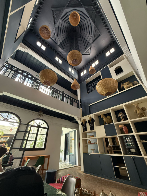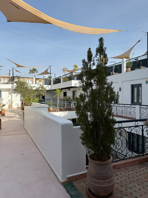 Klar kann man ausserhalb der Medina in einem Hotel wohnen. Das bedeutet aber täglich den Weg ins Stadtzentrum (und das ist nun mal die Medina) auf sich zu nehmen. Mit dem Taxi, Bus oder in Marrakechs Hitze zu Fuß. Alles kein Spaß. In der Medina selbst sind die Häuser im Riad-Stil angelegt. An den Seiten und der Rückwand mit den umliegenden Häusern verbunden und nur von vorne begehbar. In der Mitte ein ruhiger, grüner Innenhof oft mit einem Springbrunnen. Oben eine Rooftop Terrasse welche absoluten Weitblick gewährt. Dies ist deshalb möglich, weil so ziemlich alle Häuser innerhalb der Medina die gleiche Höhe haben.