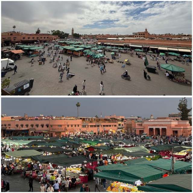 So ruhig wie es unter tags hier ist, gegen Abend erwacht der Jemaa el-Fna zum Leben. Wie verabredet werden plötzlich von allen Seiten Gestelle hergekarrt und Stände aufgebaut. Jeden Tag das gleiche Schauspiel. Alles geschieht in windeseile. Jeder Handgriff sitzt. Als alte Camperin bin ich schwer beeindruckt. (Bemerkung am Rande: Wer so etwas schon einmal auf einem Campingplatz beobachtet hat… da ist bei manchen der Urlaub vorbei bevor er überhaupt angefangen hat.) Von meinem Platz im Café Restaurant Argana aus, konnte ich das Treiben entspannt beobachten. Hier oben ist es ruhig und es weht ein angenehmes Lüftchen über die schattige Terrasse.