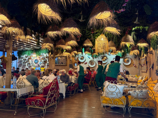 Andere Länder, andere Sitten. Da sitze ich also, genieße mein Essen im Dar Naji und denke bei mir: was für ein Schlachtfeld. Meine Nachbarn haben den Tisch und auch den Boden zurückgelassen, wirklich unglaublich. Eine komplette Mess! Schnell war Personal mit dem Besen und dem Glasreiniger da (auf den Tischen gibt es – aus gutem Grund – eine Glasplatte) und im Nu war alles wieder sauber. Und genauso schnell begriff ich, daß das hier so üblich ist mit der Mess. Die Menschen legen das Essen auf den Tisch, was auf den Boden fällt interessiert niemand.