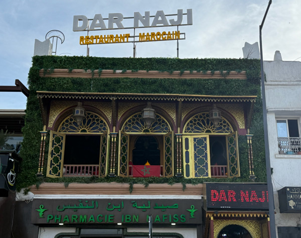 Innnerhalb der Medina selbst gibt es leider irgendwie nur entweder Fast Food (und zwar an jeder Ecke) oder Touristen-Lokale die mit einer normalen Tajine zu 250 DH in meinen Augen den Vogel abschießen. Mein Dank gilt erneut dem Guide Routard. Er hat mich zum Dar Naji geführt. Dieses Lokal, gleich außerhalb der Medina gelegen, wird fast nur von Einheimischen besucht. Das Essen ist ausgezeichnet und (für unsere Verhältnisse) günstig. Ich habe es an keinem Abend geschafft mehr als 85 DH auszugeben. Der Blick auf die Medinamauer von meinem Platz im Dar Naji aus, wirklich toll!